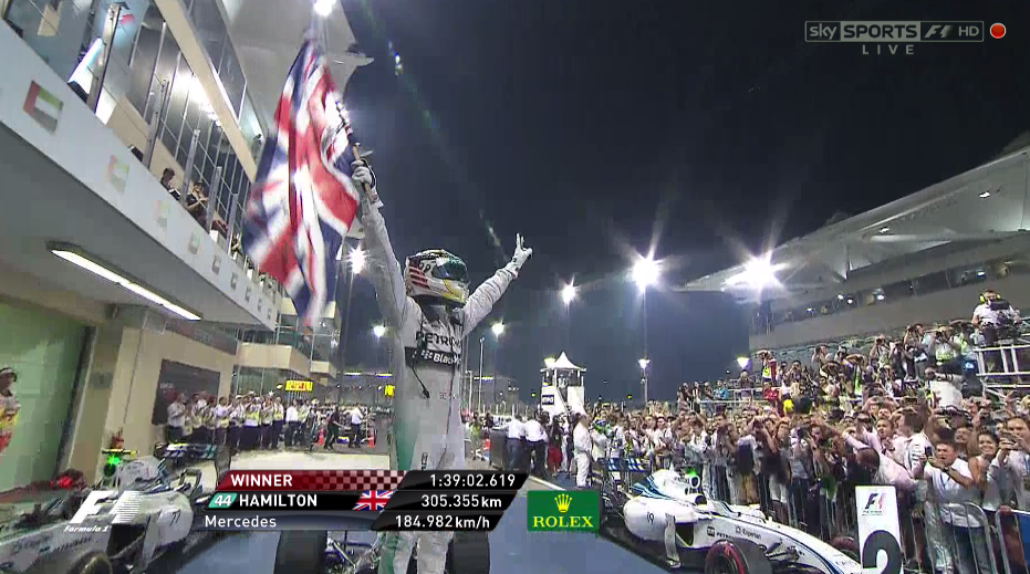 Lewis Hamlton gana la carrera y el Mundial de F1 de 2014 seguido de los dos Williams. Rosberg con problemas eléctricos no ha podido plantar cara a ningún coche aunque no ha llegado a abandonar porque no ha querido rendirse en ningún momento.