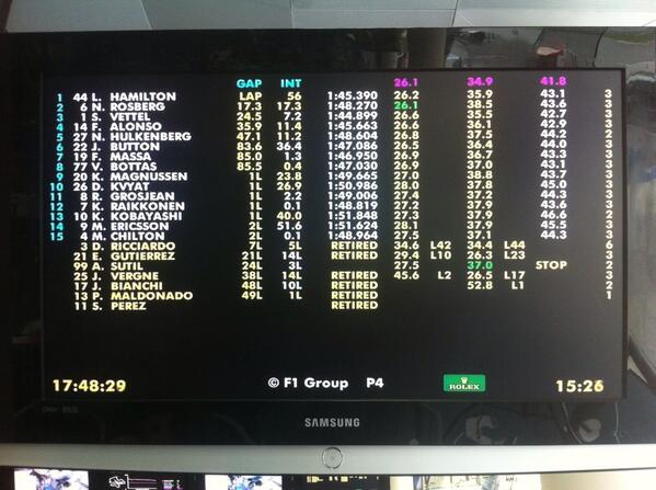 Dicen que la lluvia se acerca al circuito, no sabemos si lloverá en la parte final. Vettel se acerca mucho a Rosberg. Sutil se para en la recta y Gutiérrez también tiene que abandonar por problemas mecánicos.