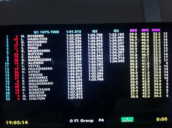 ELIMINADOS DE LA Q1: Maldonado, Sutil, Kobayashi, Bianchi, Ericsson y Chilton.