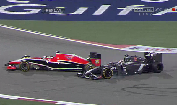 Accidente de Esteban Gutiérrez y Pastor Maldonado. El venezolano ha salido muy pasado del box y se ha llevado por delante a Esteban el cual ha dado una vuelta de campana. Unas imágenes espeluznantes que han hecho sacar al coche de seguridad (SC).