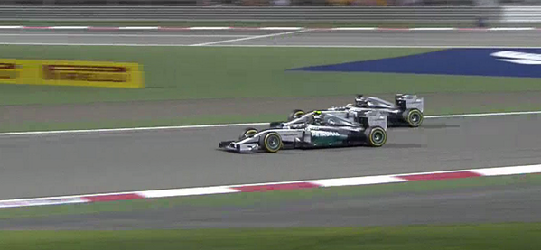 Luchas fratricidas entre los Mercedes, los Williams, los Force India y los Red Bull. Sanción de un stop and go de 10 segundos para Maldonado por el accidente. Button abandona por un problema mecánico. Ricciardo adelanta a su compañero en la recta. Y lucha por la victoria entre Hamilton y Rosberg que a punto han estado de perder las dos posiciones. Massa intenta adelantar a Vettel pero esta más pendiente que su compañero no lo adelante a él.