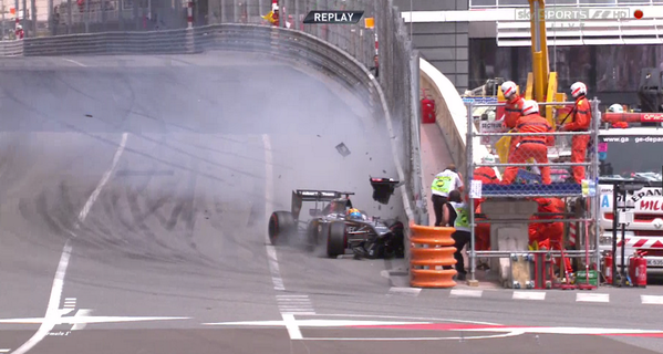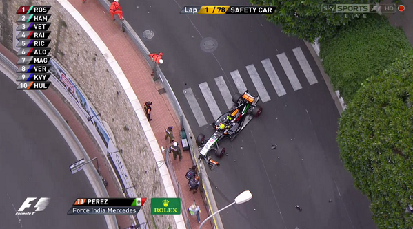 Primer accidente! Causado por Pérez que ha impactado contra el muro en la bajada de Loews. Y el Safety Car en pista.