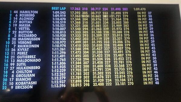 Rosberg vuelve a aparecer cuando ya ha solventado su problema con la unidad de potencia. El piloto alemán se coloca primero y el inglés segundo. Hamilton finalmente supera a su compañero de equipo y Alonso se coloca tercero a 374 milésimas. Ricciardo ocupa la sexta plaza, Kimi la décima y Vettel la duodécima.