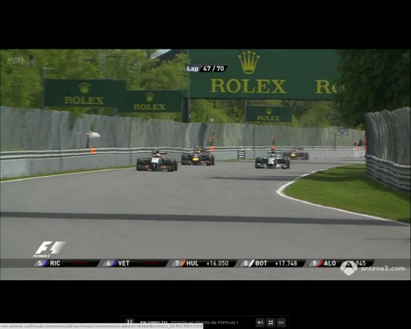 Ricciardo presionando a Pérez para poder así acercase a Rosberg. Pero Pérez no es el único que hace tapón sino también su compañero. Bottas intenta adelantar a Hulkenberg pero casi se tocan acto que aprovecha Massa para adelantar.