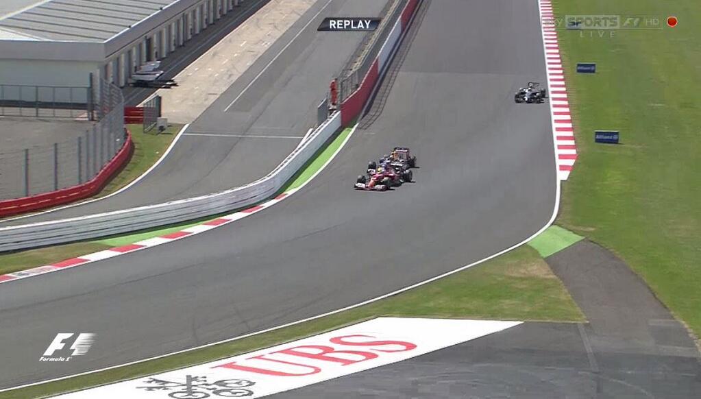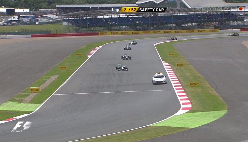 Los pilotos se colocan en sus coches y se lleva a cabo la resalida con el Safety Car que solo dura una vuelta para comprobar que esta todo en orden. Hamilton en dos vueltas se ha colocado segundo y ha adelantado a los dos McLaren y Alonso ya se encuentra dentro del Top 10. Alonso sancionado con un Stop and Go de 5 segundos por colocarse mal en la salida. Increíble toque entre Maldonado y Gutiérrez que ha finalizado con el mejicano fuera de combate.