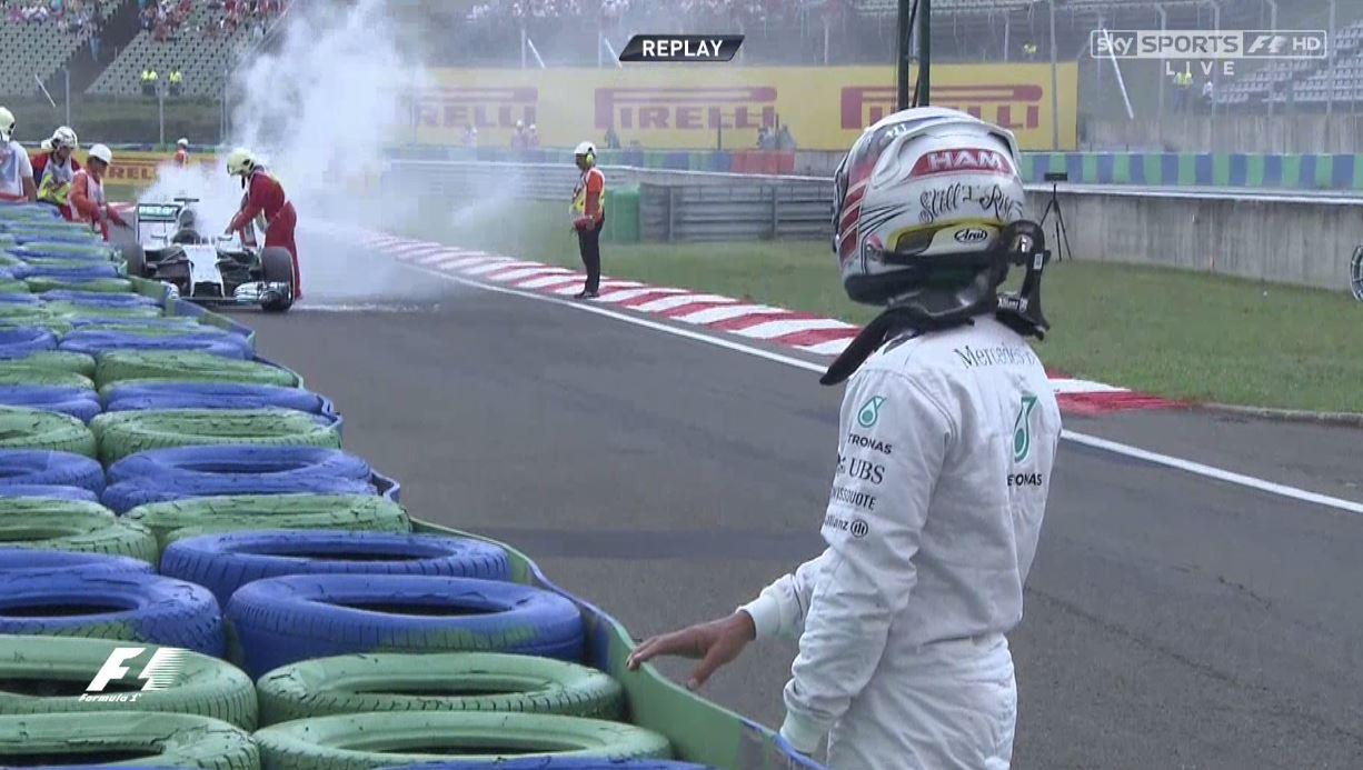 Rosberg empieza el primero la vuelta de formación cuando se va de largo. Y es que Magnussen en el mismo sitio se ha ido contra el muro. Bandera roja en pista.