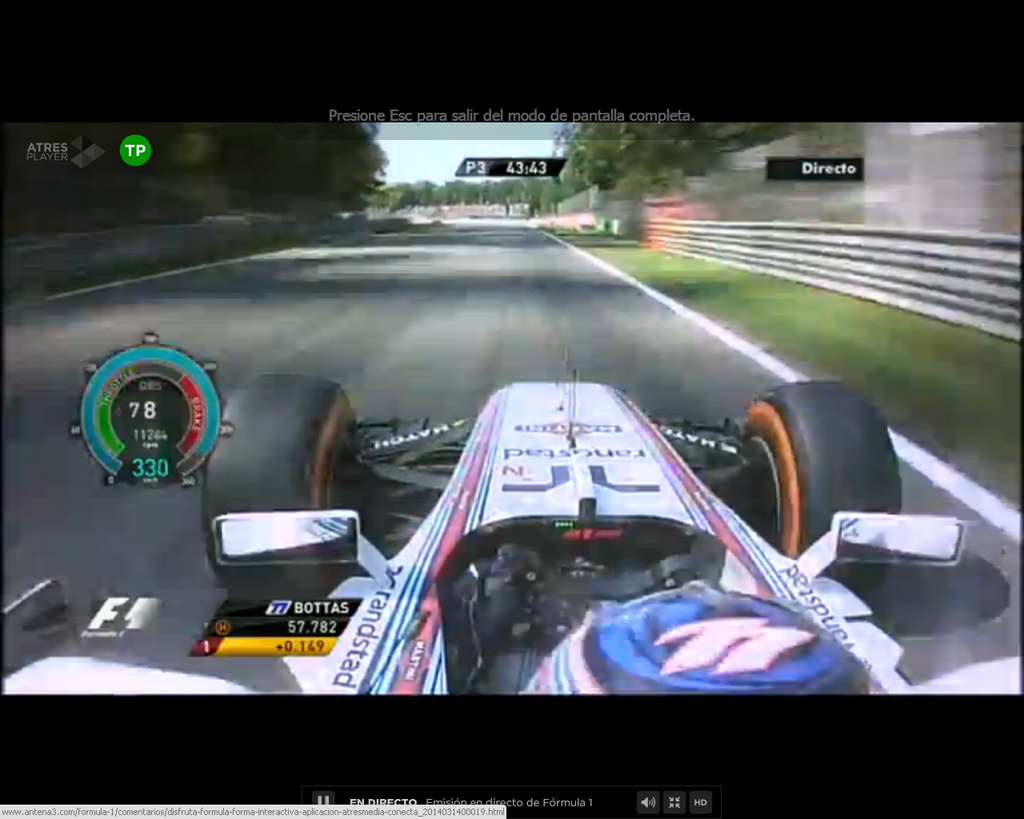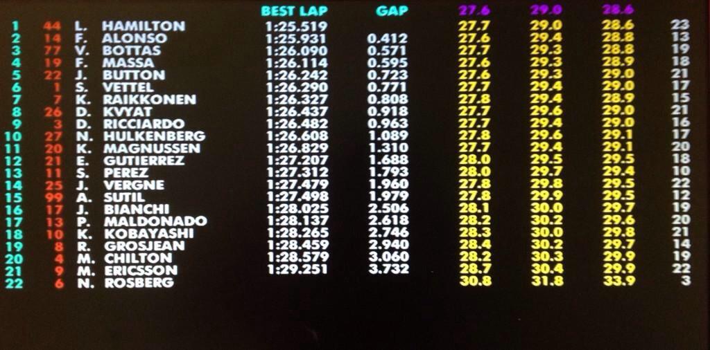 Los dos Williams ya se encuentran al frente de la clasificación. Alonso se coloca primero tras realizar su última vuelta. Hamilton entra en pista y destroza los cronos con el neumático duro (1'25''742'''). Hamilton coloca el neumático medio y calca el crono. Por detrás, mejoras de cronos y peleas por clasificar adelante. Alonso mantiene la segunda posición tras mejorar su crono y Bottas se sitúa justo detrás de él. Bandera a cuadros!!