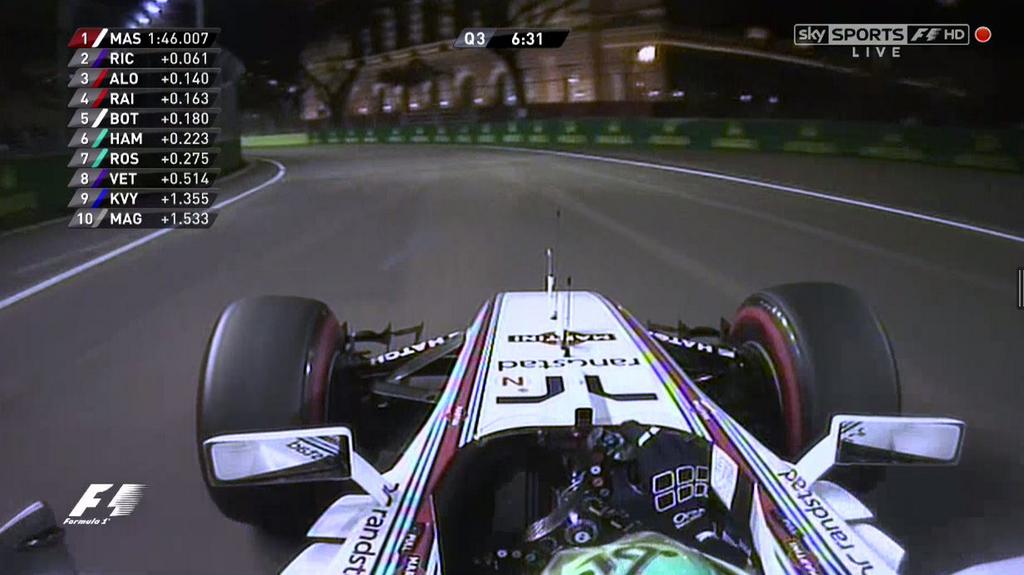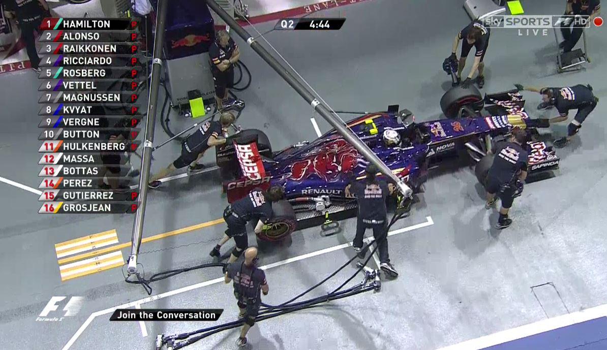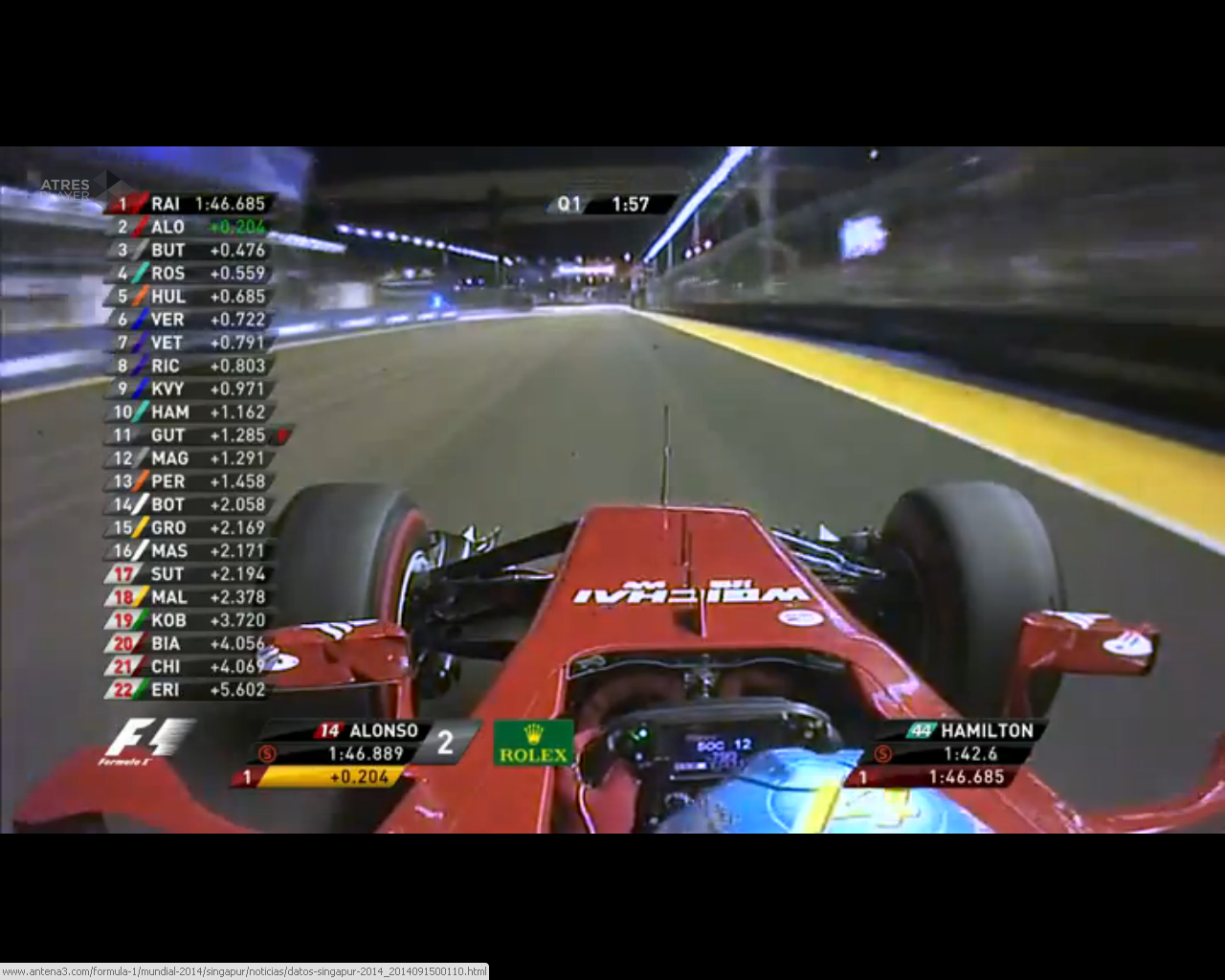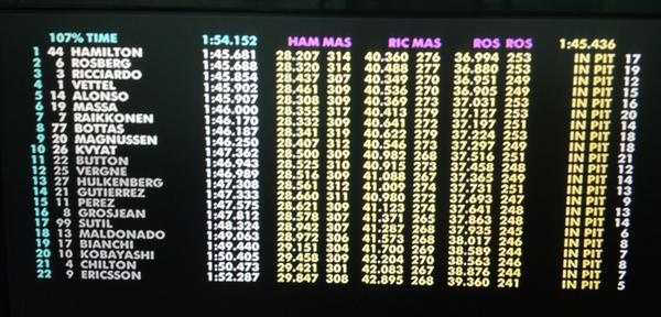 Kimi se queja por radio de que no tiene potencia y se tiene que marchar al box. Solo se mejora en el sector 3 y Ricciardo se coloca primero. Pero no le dura más que un par de segundos porque Hamilton se coloca primero. Rosberg se coloca segundo y Vettel cuarto. Alonso se tiene que conformar con la quinta plaza.