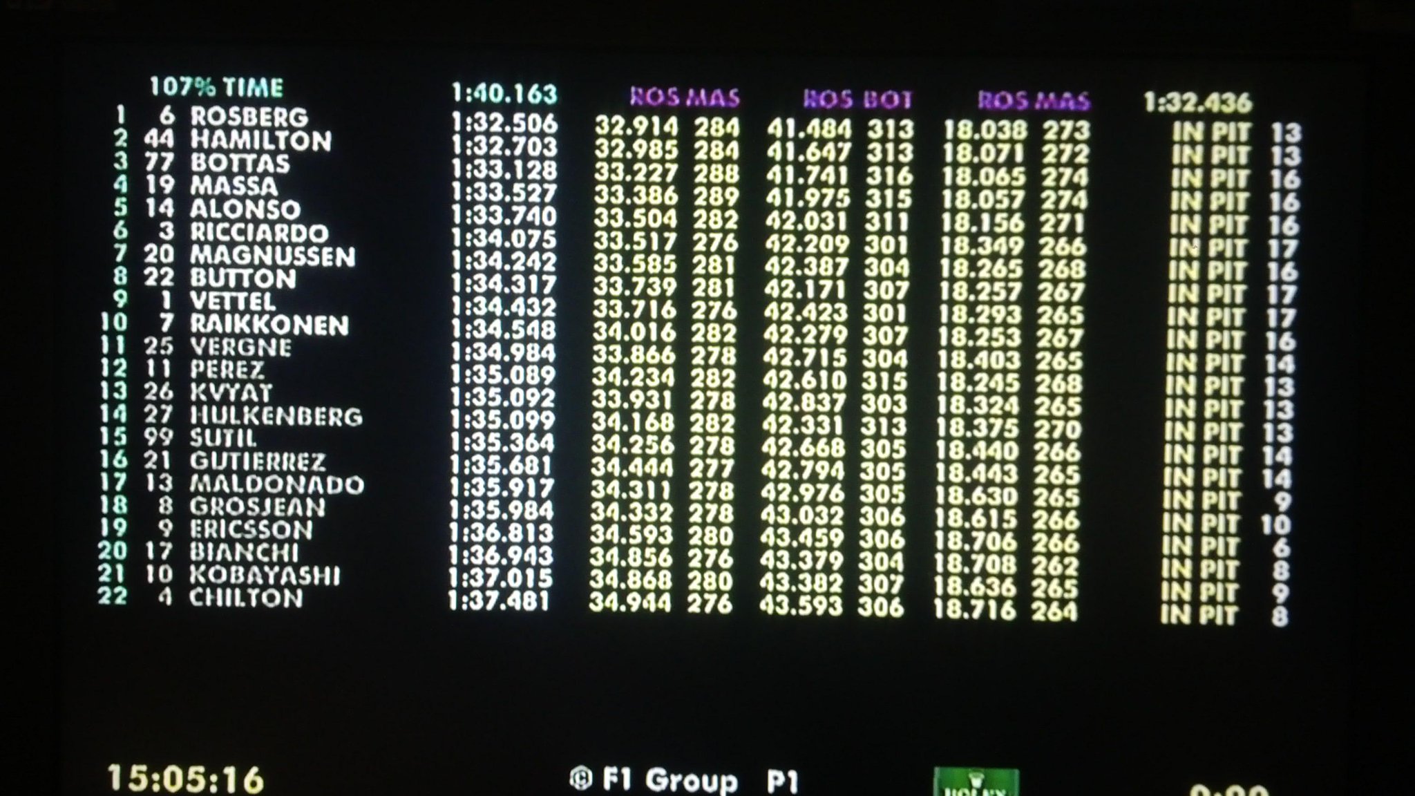 Q3: Bottas el primero en salir y marcar crono. Poco después ya salen todos los pilotos, excepto Kimi que se queda en el box. Rosberg primero, Hamilton segundo, Bottas tercero, Massa cuarto y Alonso quinto.