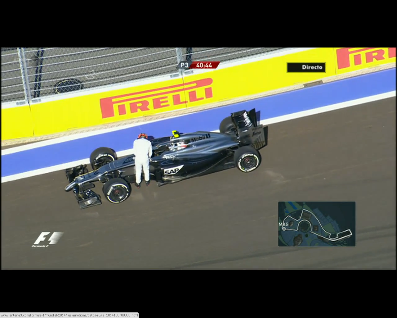 Volviendo a la actividad en pista, el semáforo se pone en verde y los monoplazas salen a realizar su vuelta de instalación. Maldonado presenta problemas con el ERS, se baja del monoplaza y los mecánicos empiezan a trabajar para solventar los problemas. Bandera roja! El monoplaza de Magnussen se ha quedado parado en medio de pista.