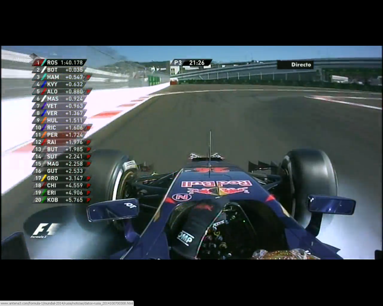 Hamilton se coloca primero y Rosberg segundo. Bandera amarilla! Hamilton ha sufrido un trompo en la penúltima curva del trazado, a destrozado los neumáticos. La sesión ha finalizado para él. Chilton se baja del coche, problemas mecánicos para el piloto inglés.