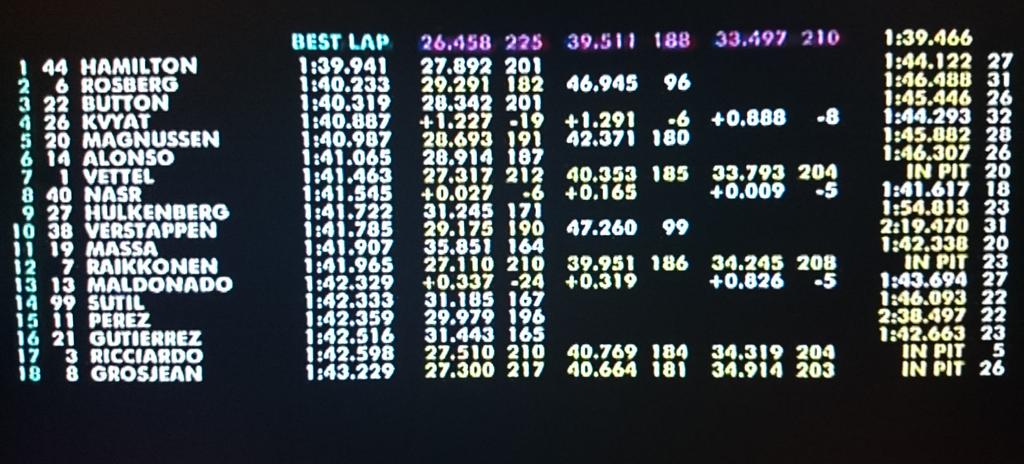 Los Mercedes se colocan al frente a falta de 30 minutos para el final. Mientras, Ricciardo parece que reporta algún problema de motor, porque solo ha rodado 5 vueltas y se mantiene cerrado en el box. Los dos Mercedes, los dos McLaren y Kvyat se están centrando en la alta carga de combustible. Vettel finaliza antes de tiempo su sesión por problemas mecánicos. Final de la sesión!