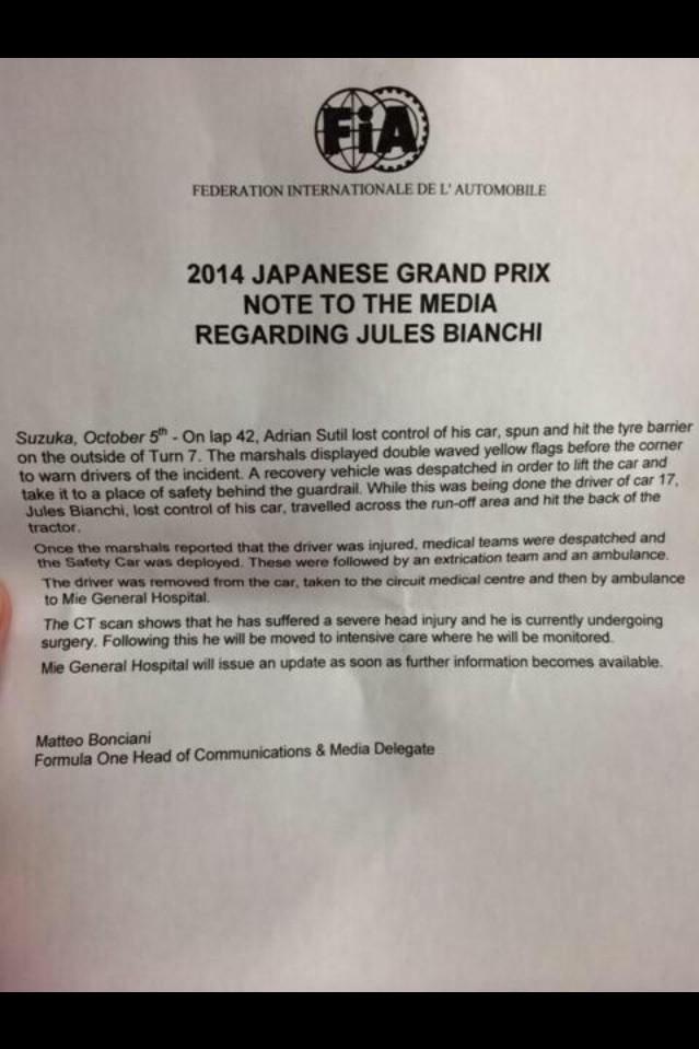 - A la 13:30h, la FIA emitia un comunicado explicando las causas del accidente y informando que después de la operación será trasladado a la UCI. Además de informar que el próximo comunicado lo suministrará el hospital.