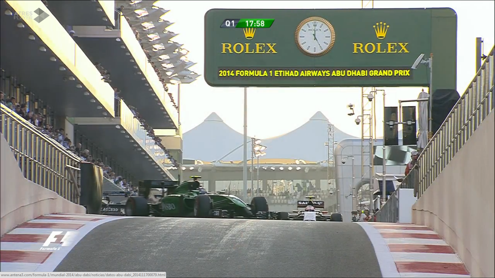 Q1: Las condiciones meteorológicas son de 26 grados en el aire y 33 sobre la pista. Son 10 grados menos que en los Libres 3, por tanto, su comportamiento puede variar. Los primeros coches salen a pista con goma blanda, excepto los hombres de Caterham que llevan goma súper blanda.