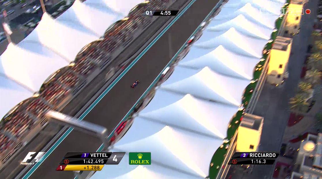 Q3: Empieza el último asalto para saber quien saldrá mañana primero. Realmente no es tan importante salir primero ya que solo en 2010 el que salía desde la Pole ganó la carrera. Bottas el primero en salir pero se coloca cuarto por delante Massa y los Mercedes. Hamilton se queja por radio de vibraciones ese puede ser el motivo de su mala vuelta.
