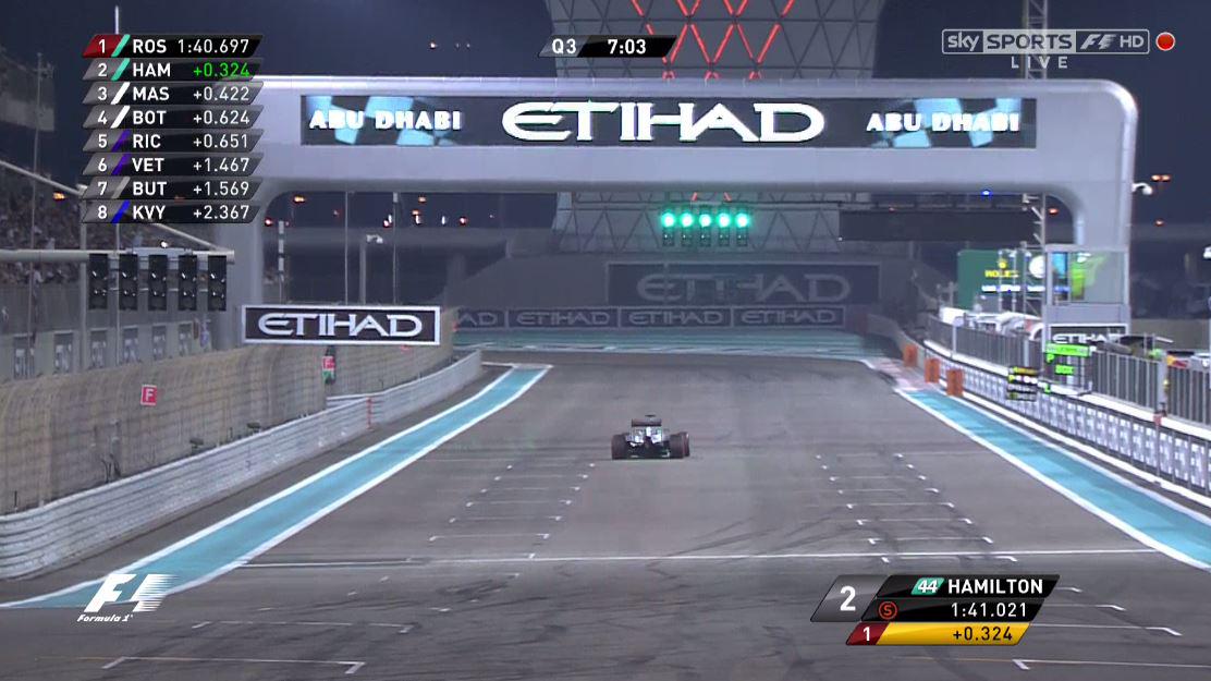 Todos vienen mejorando excepto Hamilton que realiza un mal primer sector. Bandera a cuadros! Rosberg se lleva la Pole seguido de Hamilton y los dos Williams. Mañana veremos quien se proclama campeón si Hamilton o Rosberg, la puntuación doble tan criticada va a proporcionar mucha emoción de cara a la carrera de mañana. Hasta entonces!