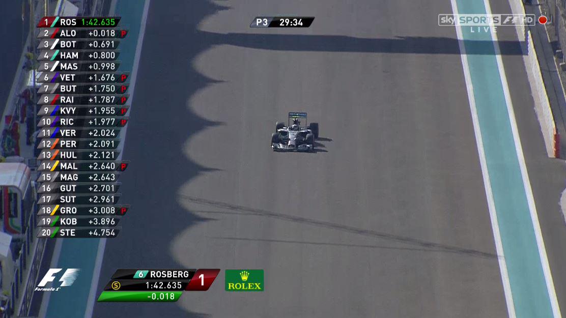 Williams, Mercedes, Sauber y Lotus los primeros en salir con goma súperblanda. Rosberg se coloca primero y Hamilton no puede superar el crono de su compañero. Pérez sufre un trompo en la curva 11. Final de la sesión! Los pilotos realizan una simulación de salida en la recta de meta, ya que las características del pitlane no permiten hacerlo ahí.