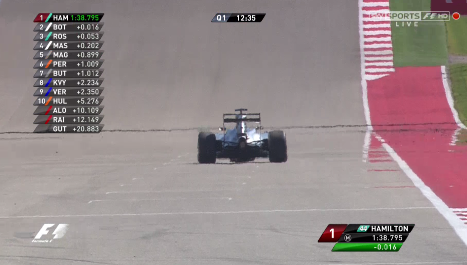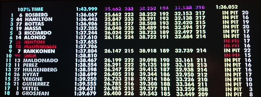 Vettel realiza su crono que esta dentro del 107% y poco más va ha hacer durante esta Q1. Se confirma que el problema de Hamilton era un plano en el neumático que le provocaba muchas vibraciones. Los Mercedes y los Williams al frente, mientras Force India, Toro Rosso, Sauber y Lotus intentan escapar de la zona de eliminación.