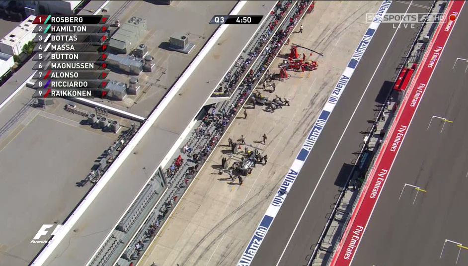Q3: Todos los pilotos salen a pista, excepto Sutil. Rosberg se coloca primero, seguido de Hamilton, Bottas y Massa. Los pilotos tras este primer intento entran a cambiar gomas y colocan neumáticos nuevos. Ricciardo es el primero en salir.