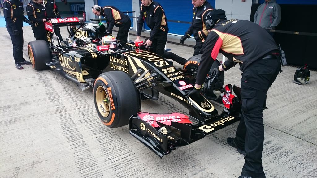 A las 10:25h, el Lotus de Maldonado hace acto de presencia en la pista española y realiza su primera vuelta de instalación.