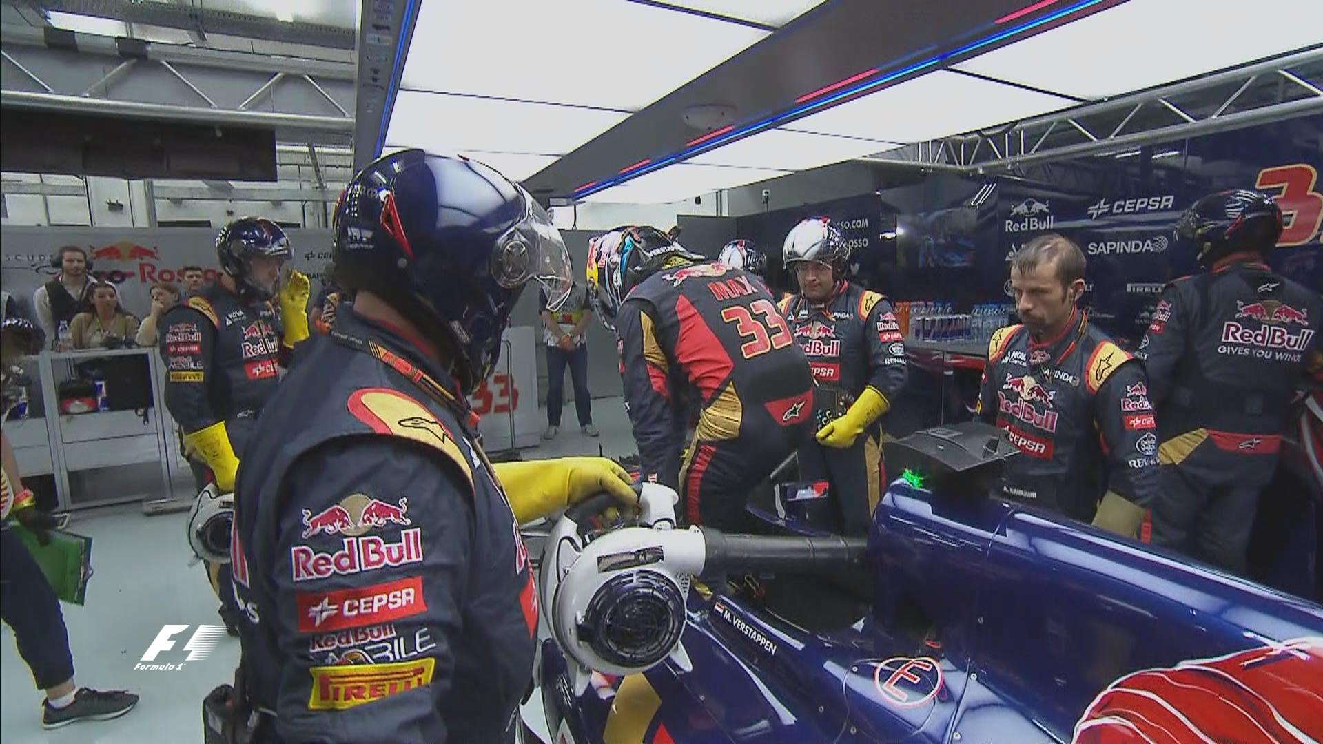Vettel vuelve a entrar por la pequeña excursión que ha tenido, le cambian el alerón. Alonso coloca goma media. Kimi entra en boxes tras ser adelantado por Hamilton. Problemas en el box para Maldonado, abandona debido a un problema en los frenos.