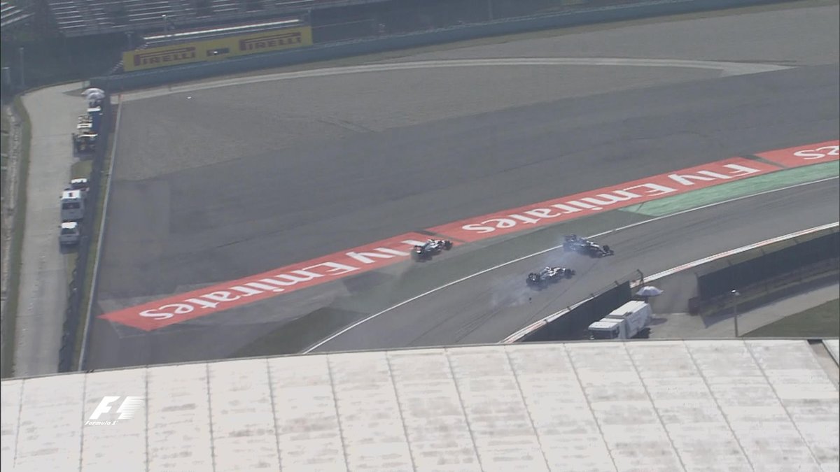 El semáforo se apaga y arranca el Gran Premio de China. Hamilton mantiene la primera posición tras salir a tapar su posición a Rosberg que se mantiene segundo. Vettel controla la tercera de los ataques de los dos Williams y Kimi que han salido muy lanzados. Ricciardo que salía séptimo ha tenido problemas de agarre y ha caído al final de la cola.