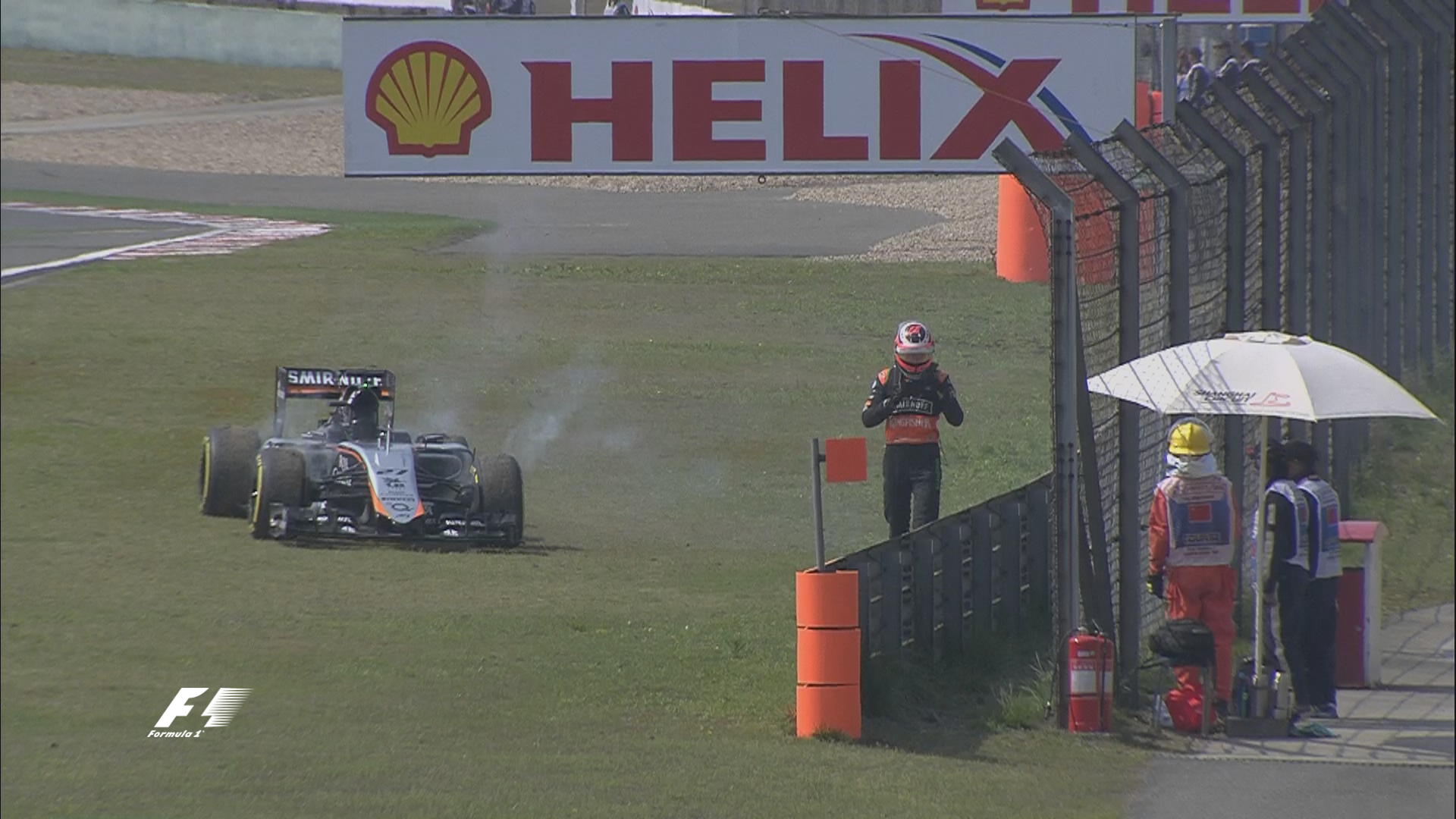 Hulkenberg abandona. Retira el coche de la pista y se baja. Parece que ha tenido un problema electrónico. Los comisarios ondean la bandera amarilla y la FIA considera que no es necesario sacar el Safety porque se puede retirar el coche sin problemas.