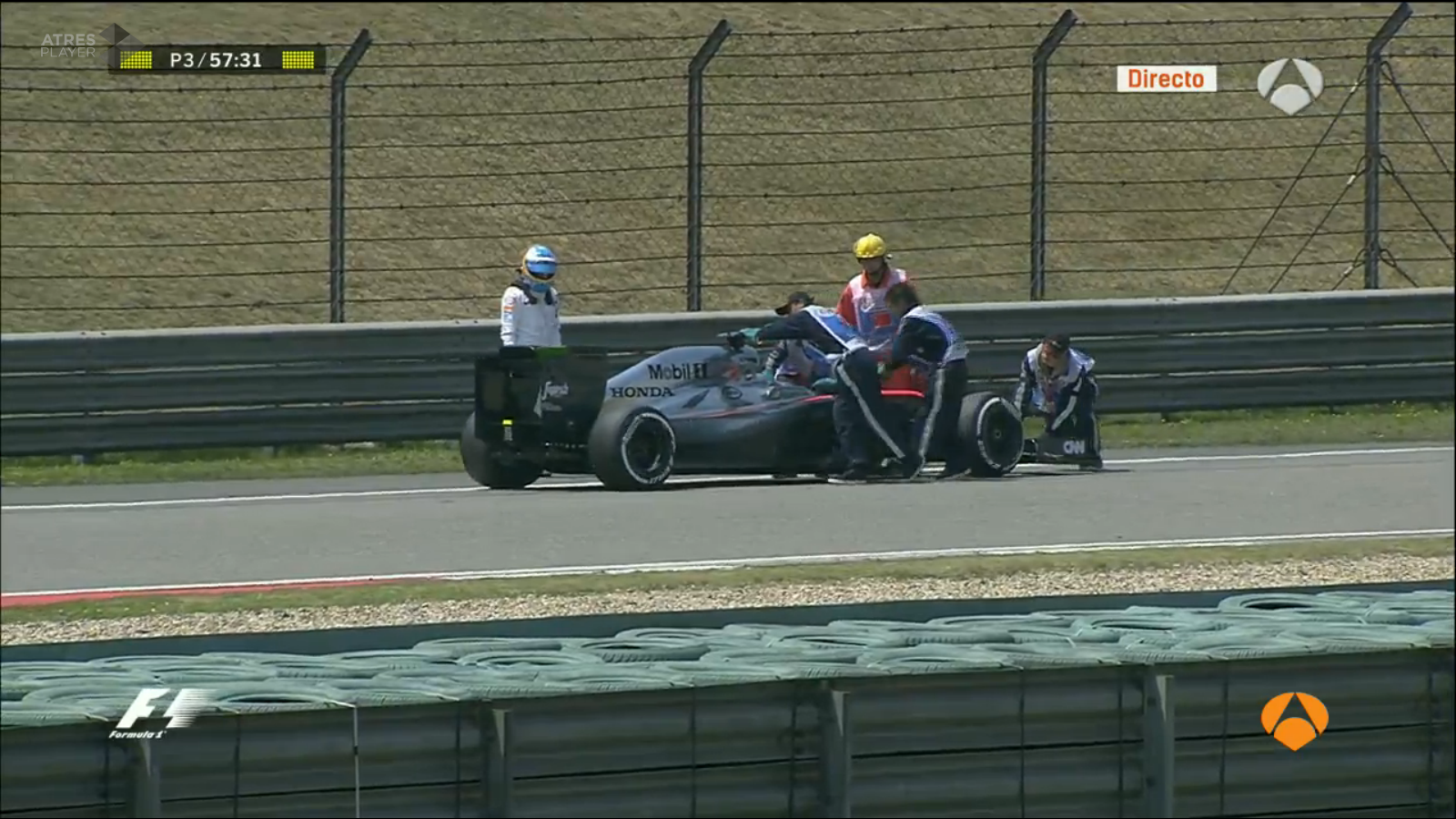Volviendo a la pista el semáforo al final del pitlane se pone verde y empieza la tercera sesión de entrenamientos libres. Alonso es el primero en salir, pero se queda parado. Los ingenieros han detectado un problema en el motor y le han pedido que pare el coche. Atención!!, porque McLaren ya ha cambiado tres veces motores y para la temporada solo tienen disponibles 4. Es uno de los problemas que tienen los equipos y que están tratando de convencer a la Federación para que puedan utilizar 5.