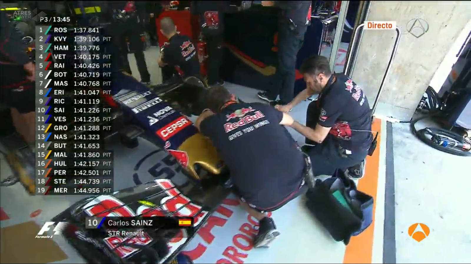 Rosberg se coloca primero y Kvyat segundo, pero sus posiciones no duran mucho porque sale Hamilton ha marcar un crono de 1'37''615''' y se coloca primero. 9 minutos para el final y los mecánicos de Alonso continua trabajando, no van a llegar para que Alonso marque un crono en esta sesión.