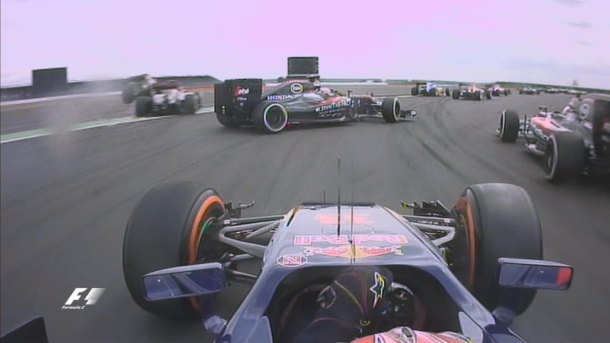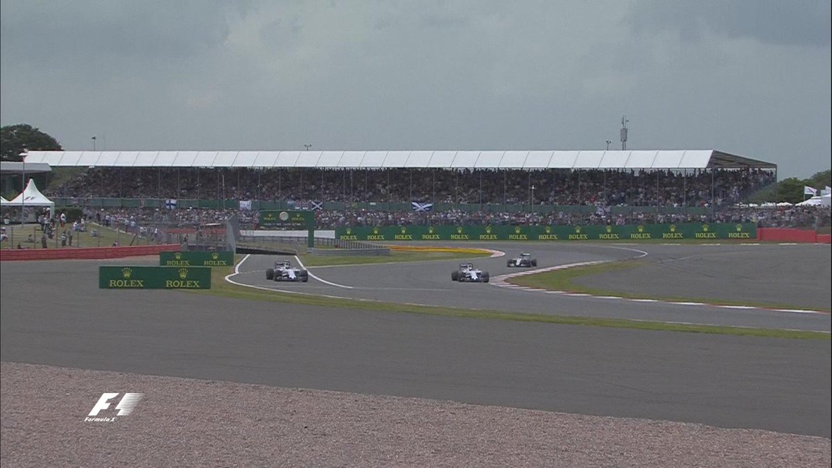 El semáforo se apaga y arranca el GP de Gran Bretaña. Enorme salida de los Williams frente a la nefasta salida tanto de Mercedes como Ferrari. Massa se coloca primero, Bottas tercero y los Mercedes caen a la segunda y cuarta plaza. Ferrari por su parte pierde ventaja frente a Hulkenberg y Kvyat.