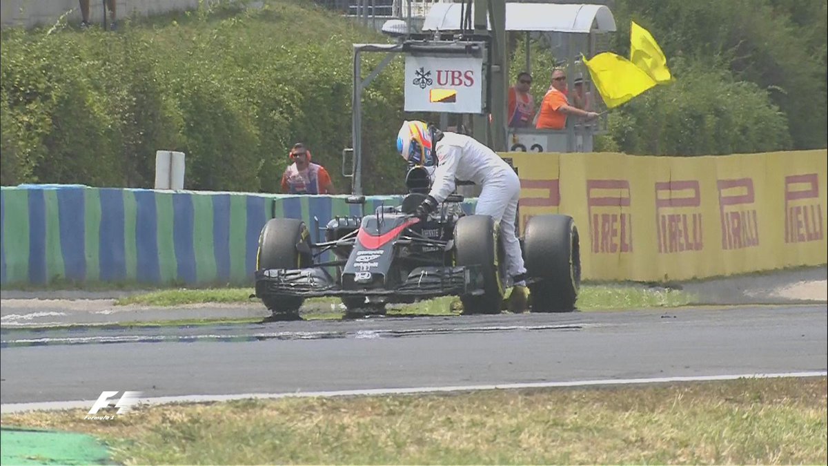 La sesión se reinicia a falta de 7 minutos para el final. Alonso tras el esfuerzo le dicen los mecánicos que no podrá volver a salir. Un revés doloroso para el equipo el cual estaba realizando el mejor fin de semana del año.