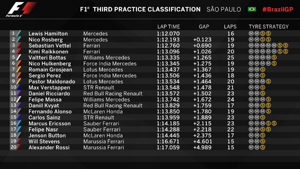 Los Libres 3 empiezan con un sol radiante, aunque esta pasada noche ha llovido bastante en Sao Paulo. Los primeros pilotos salen con goma media como es el caso de los Ferrari y Rossi. Segun vimos ayer el neumático blando será clave para la Qualy porque es bastante más rápido.