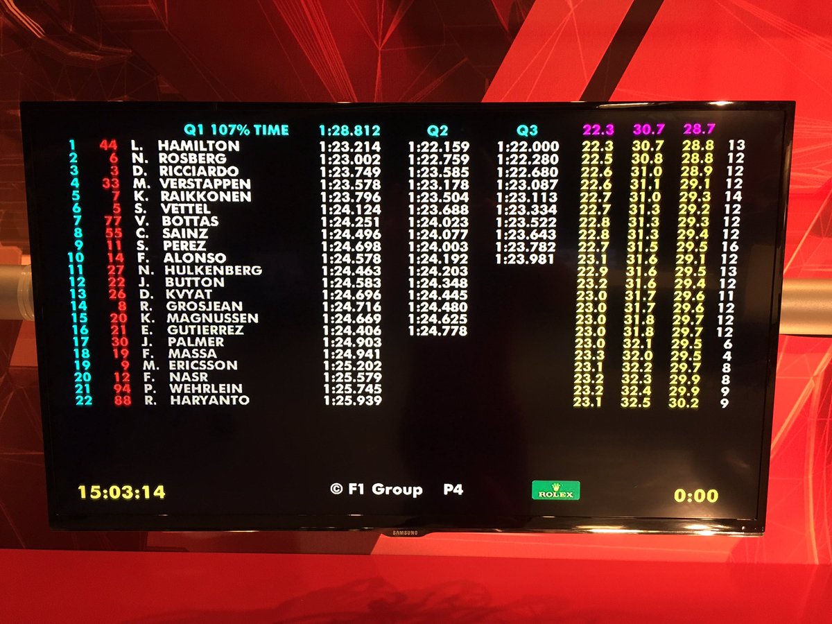Ricciardo se coloca segundo, Hamilton primero y Rosberg consigue colocarse entre ambos. Pero, nadie puede con el Hammer Time. Pole para Hamilton seguido de Rosberg y Ricciardo. Verstappen se conforma con la cuarta plaza y quintos y sextos los Ferrari, que muestran un ritmo inferior. Carlos octavo y Alonso décimo. Mañana se presenta una carrera emocionante. En los últimos 9 años en el Circuito han ganado 9 pilotos diferentes, continuará la racha. Mañana lo sabremos. Hasta entonces!