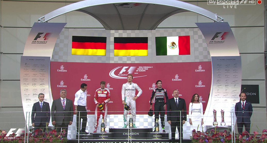 Nico Rosberg gana en Bakú después de haber liderado las 51 vueltas de la competición. En el podio le han acompañado Vettel y Pérez, el mejicano repite podio después de Mónaco. Hamilton se ha conformado con la quinta plaza después de los problemas con el coche y los dos españoles no han terminado la carrera por problemas mecánicos.