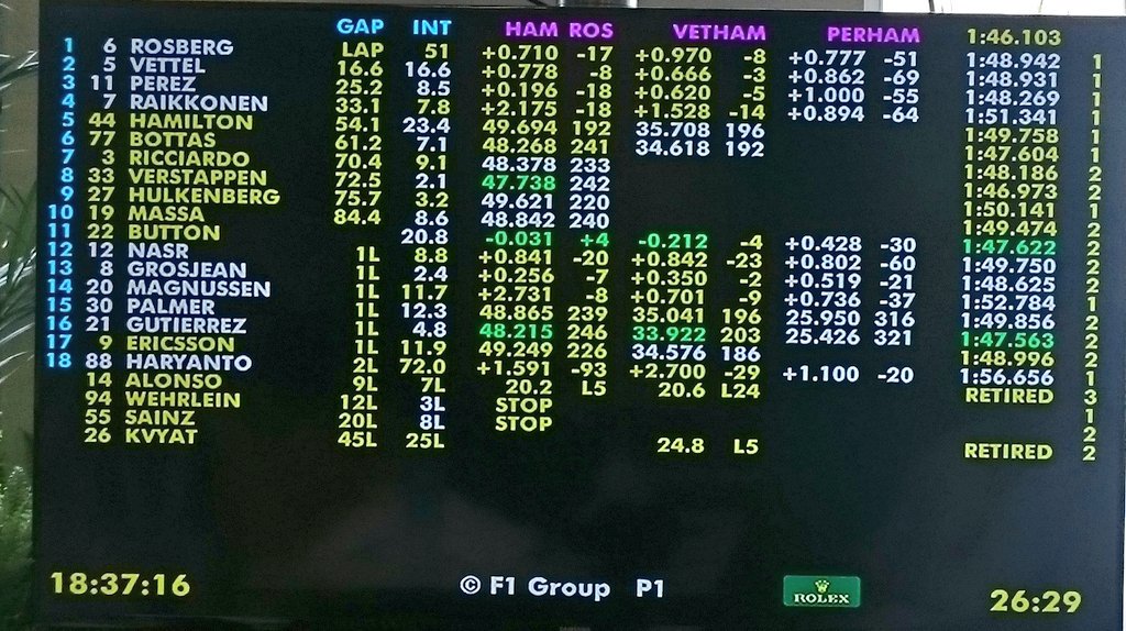En la vuelta 10, sorprendentemente, Werhlein se sitúaba dentro del TOP 10 debido a su particular lucha con Grosjean sumado al factor pitstop. Posición que ha perdido al entrar a boxes. Kimi, en su salida del pitlane ha cruzado antes de tiempo la línea y los comisarios han decidido aplicarle 5 segundos de penalización como castigo.