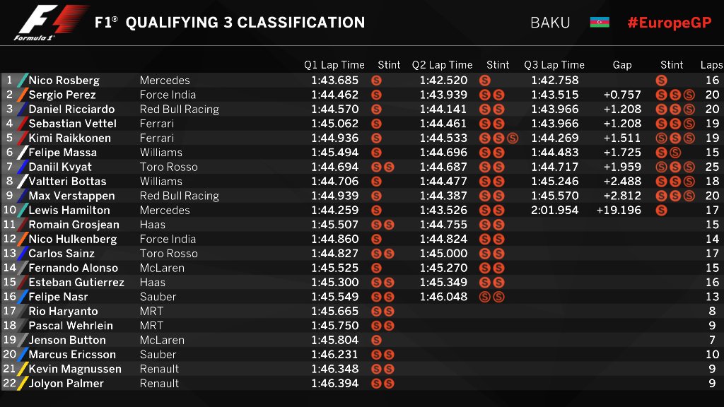 Nico Rosberg ha sido el más rápido en Baku seguido de Pérez y Ricciardo. Hamilton decia adiós en la tercera sesión tras cometer un error e impactar contra el muro. Los españoles, Alonso y Carlos, se han quedado a las puertas de la Q3 pero, esperan puntuar.