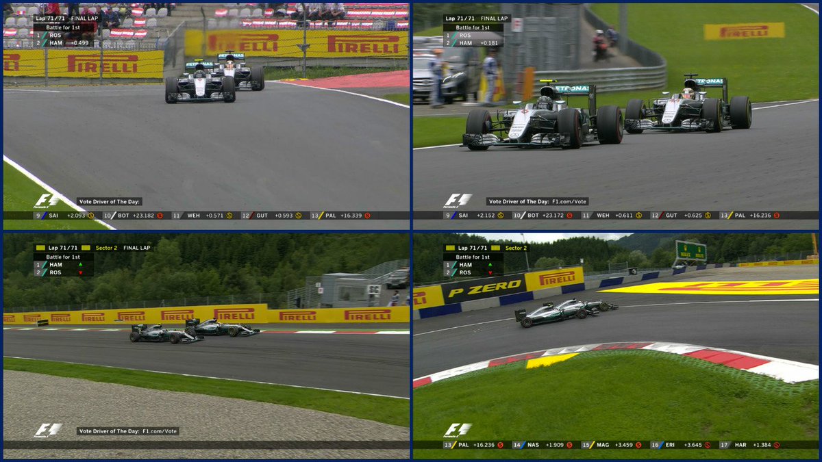 El alemán sin alerón delantero intenta acabar la carrera que gana Hamilton. En el podio se cuela Verstappen y Kimi. Rosberg cruza cuarto. Pérez sin frenos abandona antes de cruzar la linea de meta. Button P6, Carlos P8 y Pascal P10 han acabado dentro de los puntos. Los tres brillantes de principio a fin han tenido recompensa.