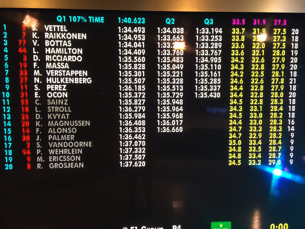 Esta vez la batalla por la Pole se ha disputado a cuatro bandas. En un primer intento Kimi se colocaba líder seguido de Bottas, Vettel y Hamilton. Aunque, el equipo Mercedes había conseguido situarse los más rápidos en Q1 y Q2, no pudieron con el ritmo demoledor de los dos Ferrari. Vettel supero a su compañero y paró el crono en 1'33''194, siendo tan sólo 0,059 segundos más rápido que su compañero de equipo.