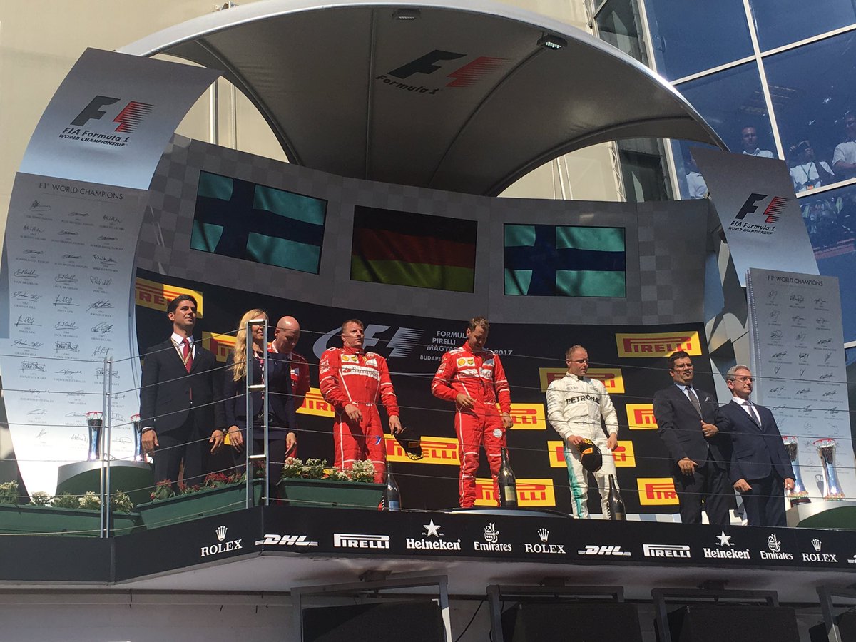 Sebastian Vettel gana en Hungría en una carrera marcada por la falta de adelantamientos y la poca emoción. En el podio le han acompañado Kimi Räikkönen (que no ha podido optar a más por órdenes de equipo) y Valtteri Bottas (gracias a la caballerosidad de su compañero que le devolvió la posición que le había cedido por órdenes de equipo también). Fernando Alonso P6 y Carlos Sainz P7 tras tener sus más y sus menos en pista.