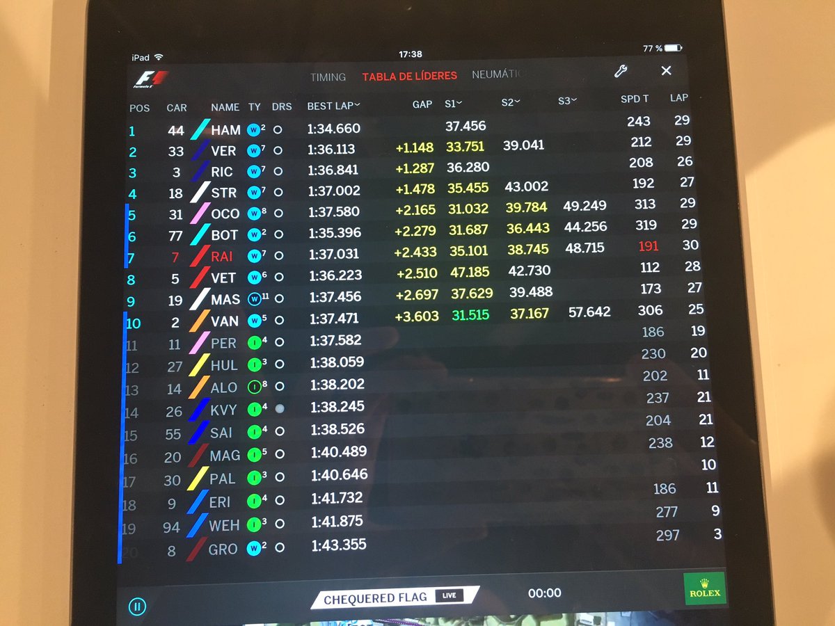 La lluvia podría haber dado más emoción a la Qualy si se hubiera corrido desde el inicio y no dejar una demora de 2h y 40 min. Aún así, los Red Bull se colaron tras Hamilton con una muestra de talento bajo la lluvia. Cuarto Stroll, con el mejor resultado de su carrera y, gracias a la penalización de los dos Red Bull saldrá segundo. La cruz, los Ferrari que han finalizado P7 y P8. Una gran desilusión aquí en casa de Ferrari y sin encontrar el ritmo en la Q3.