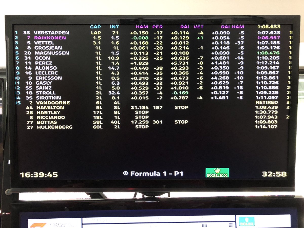 Verstappen y Kimi iniciaban una lucha por la segunda plaza cuando Bottas ha sacado el martillo y ha adelantado a ambos para situarse segundo. Vettel, mientras, perdía dos posiciones que las recuperaba de nuevo antes de terminar la primera vuelta.
