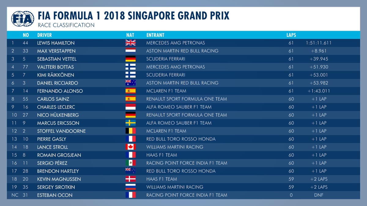 El 44 reina en la noche de Singapur. Victoria 69 de su carrera deportiva, la séptima de la temporada. Sin errores y controlando la carrera de principio a fin. No era el favorito, no tenia el coche más rápido, según los expertos. Se sacó una vuelta brillante y milagrosa ayer, para hoy sentenciar. Clavar nuevos puntos en el corazón de Vettel y Ferrari, que ayer no fue su día y hoy menos.