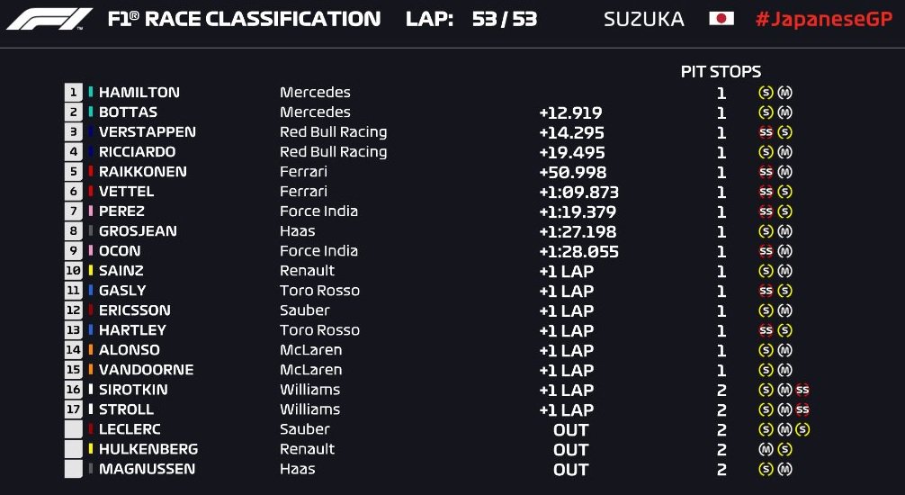 Los pilotos se han respetado en la salida y ello ha facilitado que no hubiera contactos o accidentes. Los cuatro primeros han mantenido las posiciones de salida: Hamilton mantiene el liderato de la carrera seguido de su compañero de equipo, Verstappen y Raikkonen. Aunque, los pocos cambios de posición se han producido en la parte media de la clasificación: Vettel que partía octavo (gracias a la penalización de Ocon) ha ascendido a la sexta posición, Carlos decimosegundo y Alonso asciende cuatro posiciones.⚫️⚫️⚫️⚫️⚫️— Formula 1 (@F1) 7 de octubre de 2018