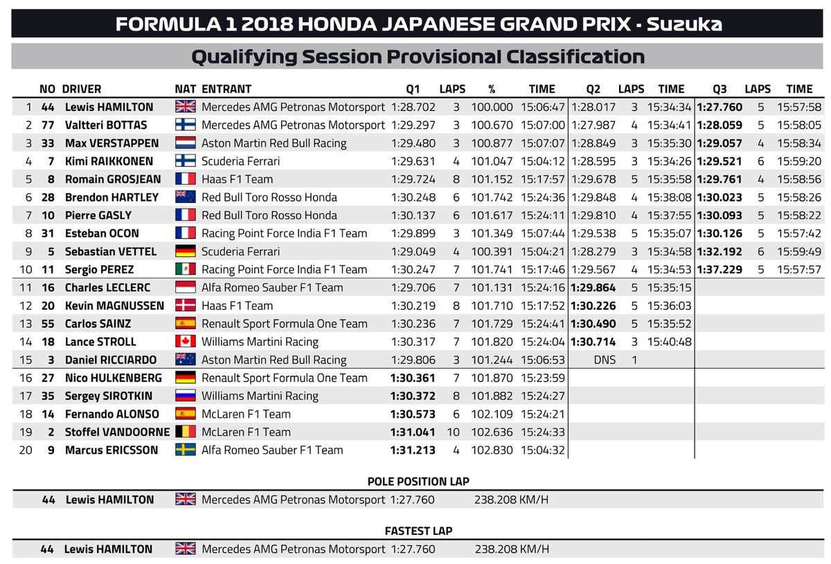 Lewis Hamilton vuelve a ser el más rápido. Es la octava vez que lo hace esta temporada y la cuarta en Japón. Pole número 80 de su carrera deportiva en el momento decisivo para proclamarse pentacampeón del mundo. Mercedes se lleva un nuevo doblete, confirmando el dominio que han tenido durante todo el fin de semana.